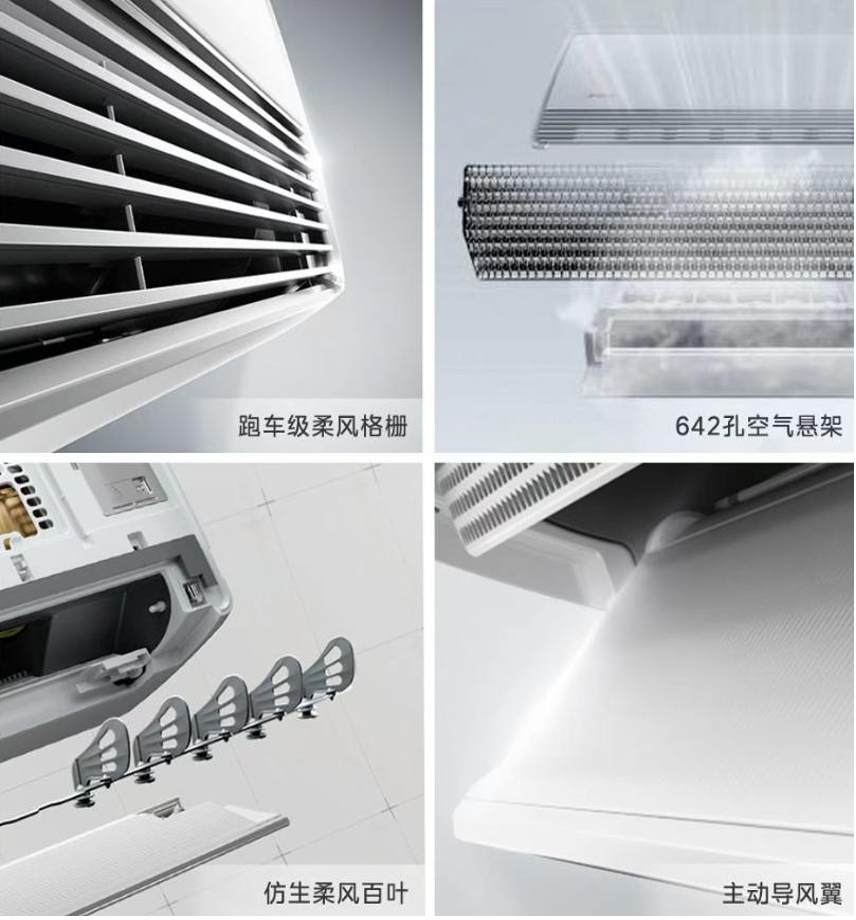 健康防护上,产品构建全维度体系,让每次呼吸都安心:99.9%抗菌防霉疏水滤网抑制细菌滋生,疏水涂层让油污灰尘一冲即净;格栅与导风翼可快速拆洗,搭配56℃高温智清洁技术,解决传统空调藏污纳垢、清洗困难的痛点,就算是换季久置后开机,吹出来的风依然清新如初。