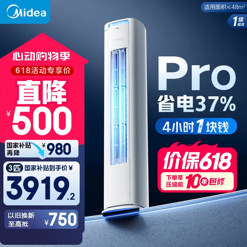 【京东自营】美的空调3匹酷省电Pro家电国家补贴新一级能效省电变频冷暖空调柜机立式KFR-72LW/